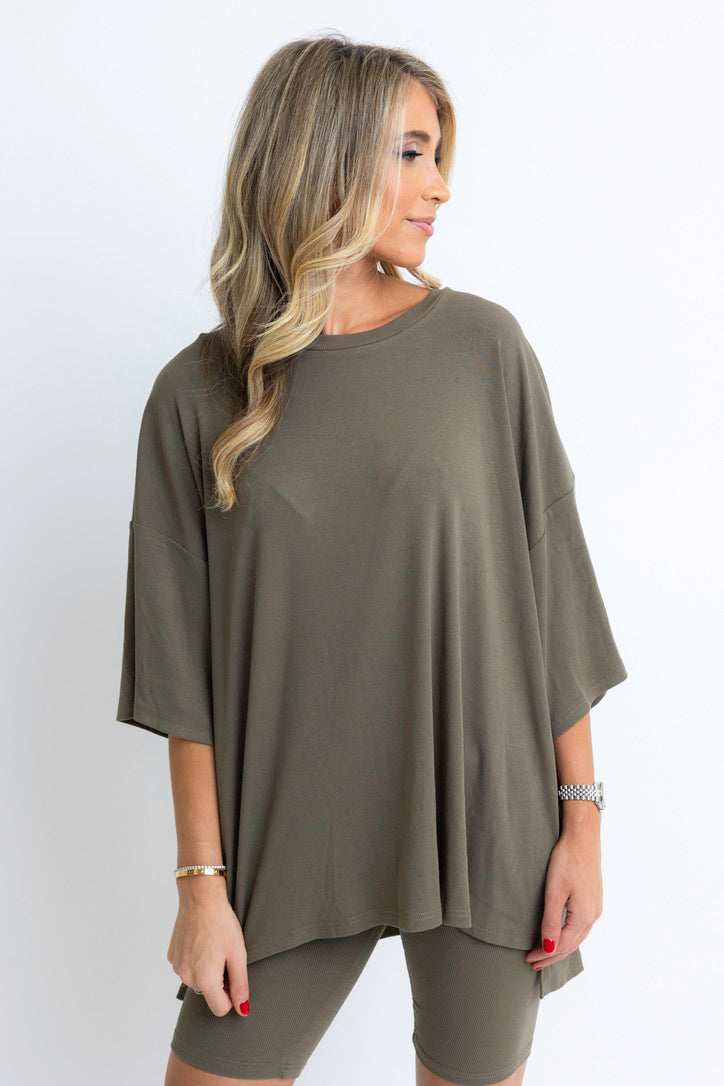 Olive Ribbed Knit Biker Shorts Set