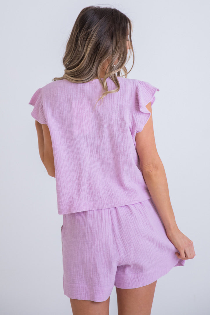 Our Gauze Pocket Shorts are the perfect choice for a comfortable, stylish look. Lightweight gauze fabric ensures all-day comfort, while the pocket detailing and tailored silhouette add a fashionable touch. Enjoy the perfect combination of style and comfort. Top sold separately. Model is 5'7", wearing a small.